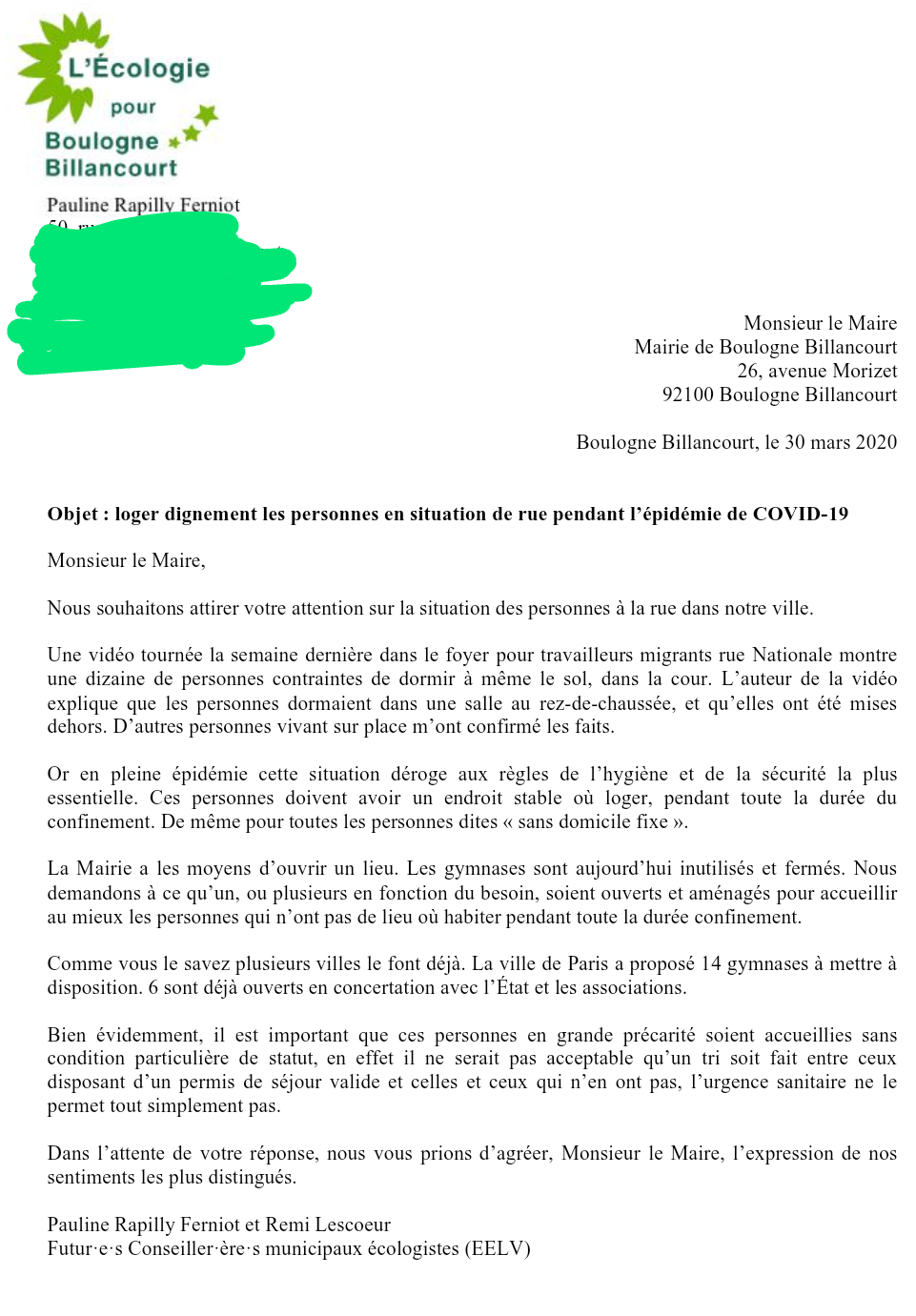 Nous lui demandions d'ouvrir un lieu pour les personnes "sans-abris" à Boulogne Billancourt.